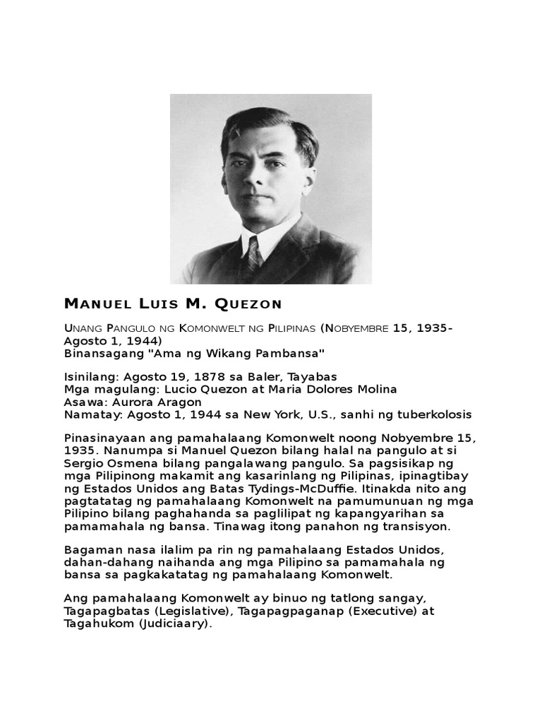 Sean henrick cruz panunungkulan ni quirino. Upang basahin ang artikulong ito sa Ingles tingnan ang Manuel L. SI Manuel Luis Quezon y Molina ay ang Pangulo ng Komonwelt ng Pilipinas mula 1935 hanggang 1944.
