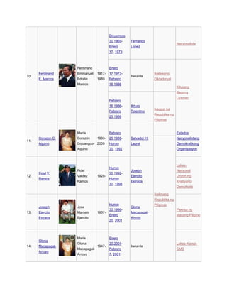 Aguinaldo - 1869 - 1964 Siya ang Pangulo ng unang Republika ng Pilipinas. Pinamunuan niya ang bansa batay sa kaisipang liberal. Unang yugto 1898-1935 Unang tumuntong sa kapuluan ng Pilipinas ang mga sundalo ng Estados Unidos noong 1898 subalit ang unang hakbang sa kanilang pamumuno sa Pilipinas ay nagsimula noong 1899 nang itinalaga ng Pangulo ng Estados Unidos na si William McKinley ang Unang Komisyon na pang-Pilipinas o Komisyon ni Schurman First Philippine Commission o.